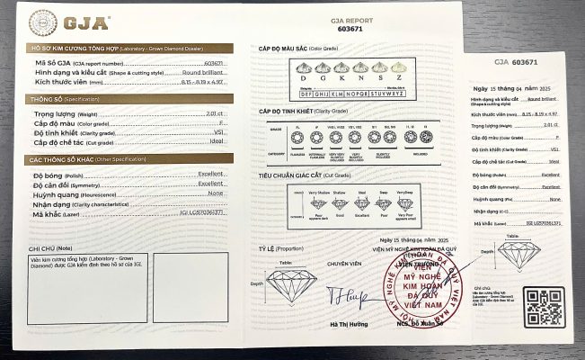 Chứng thư Kim cương tổng hợp GJA không chỉ là một bản báo cáo kỹ thuật, mà là cam kết minh bạch – chất lượng – giá trị cho mỗi viên đá quý.
