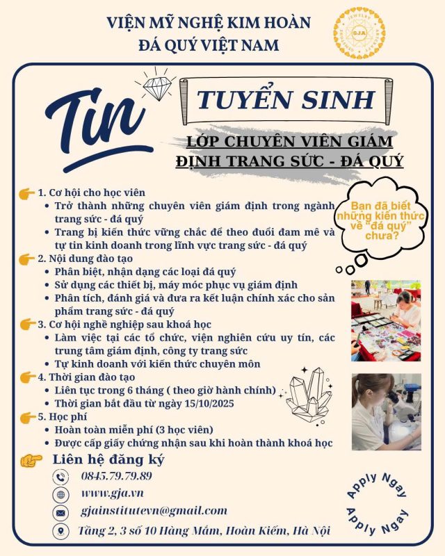 GJA LAB – Viện Mỹ nghệ Kim hoàn Đá quý Việt Nam, với nhiều năm trưởng thành và khẳng định vị thế trong top đầu Việt Nam về lĩnh vực nghiên cứu, đào tạo và phân tích trang sức – đá quý, nay chính thức thông báo tuyển sinh lớp Chuyên viên Phân tích.
